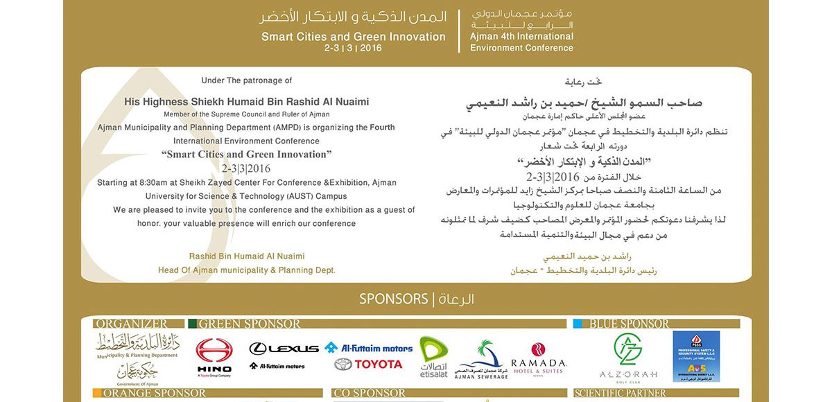 “Smart Cities and Green Innovation” 2-3 March 2016, Starting at 8:30am at Sheikh Zayed Center For Conference & Exhibition, Ajman, University for Science & Technology (AUST) Campus.